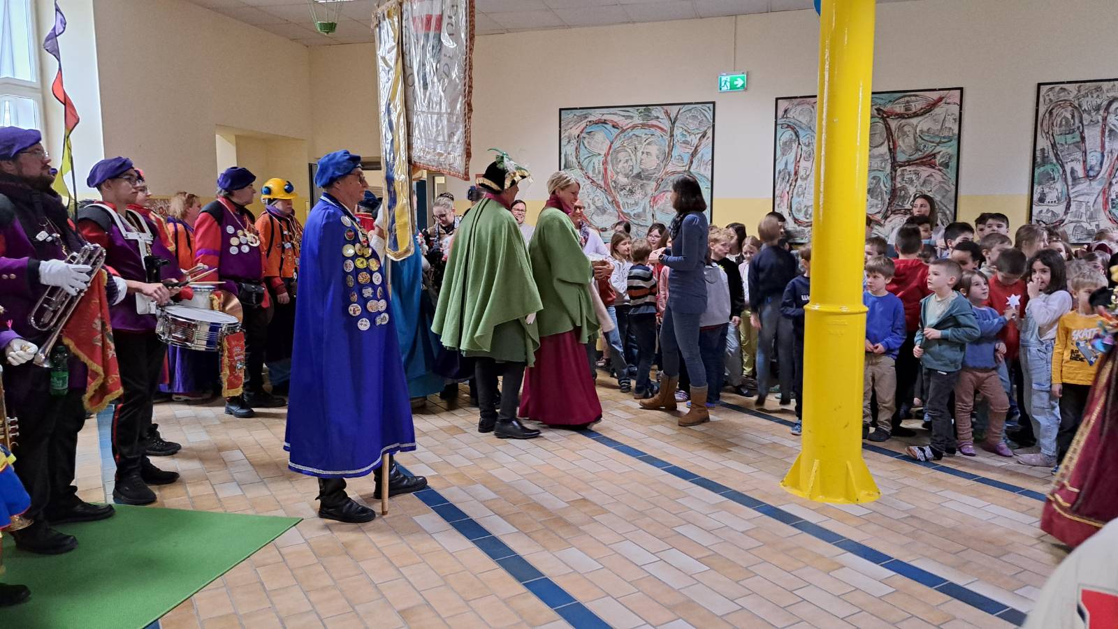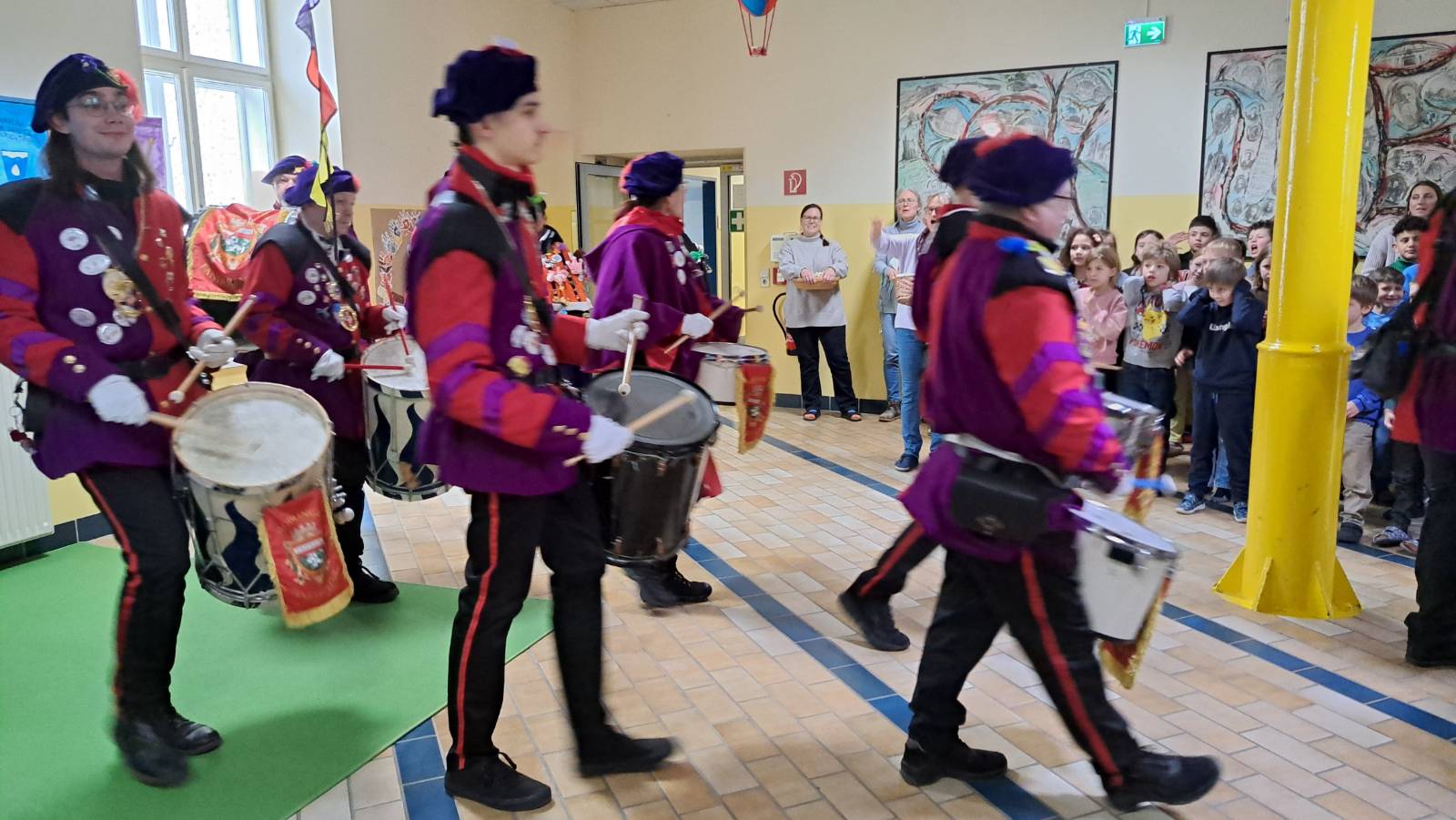 Das Herzogpaar Heinrich XVIII. und Carolin I. kam mit Fanfarenzug, Gardemädchen und vielen Zuckerl in unserer Schule vorbei.