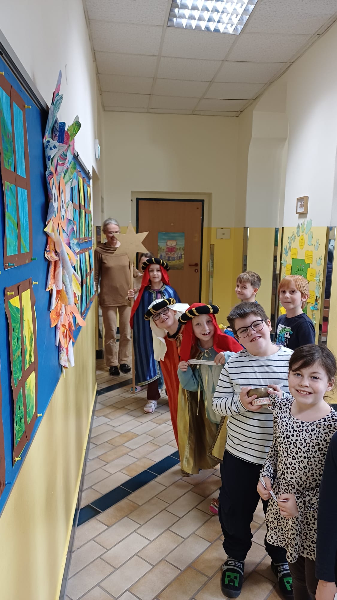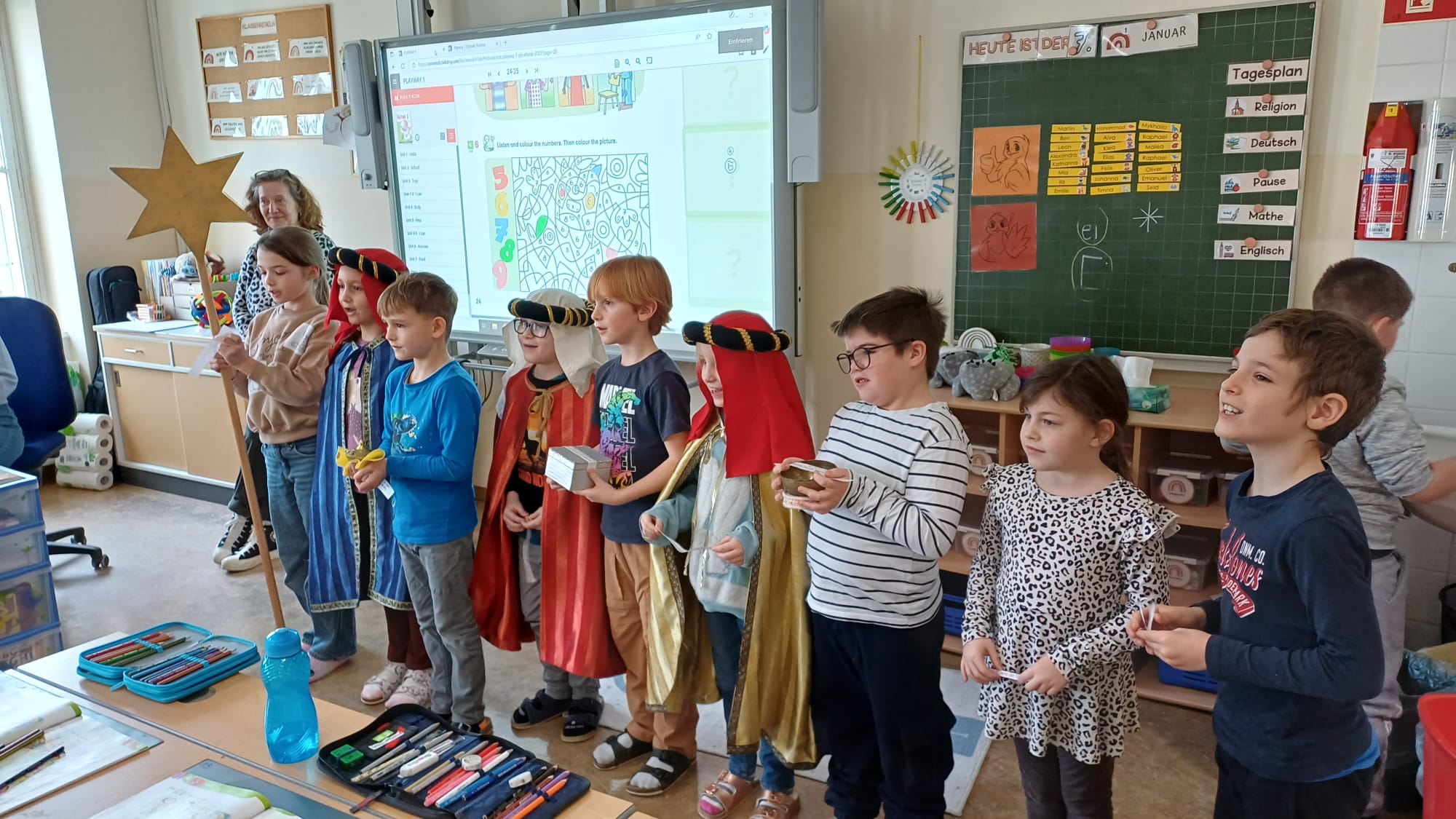 Nach ihrem Besuch beim Jesuskind haben die drei Weisen die Frohe Botschaft in die Welt hinaus getragen. Das haben wir uns zum Vorbild genommen und haben als Könige die ersten Klassen besucht. Das Weihnachtsereignis wurde in Erinnerung gerufen und Gottes Segen für das Neue Jahr erbeten: „Glück und Segen im Neuen Jahr – wünschen Kaspar, Melchior und Balthasar!“